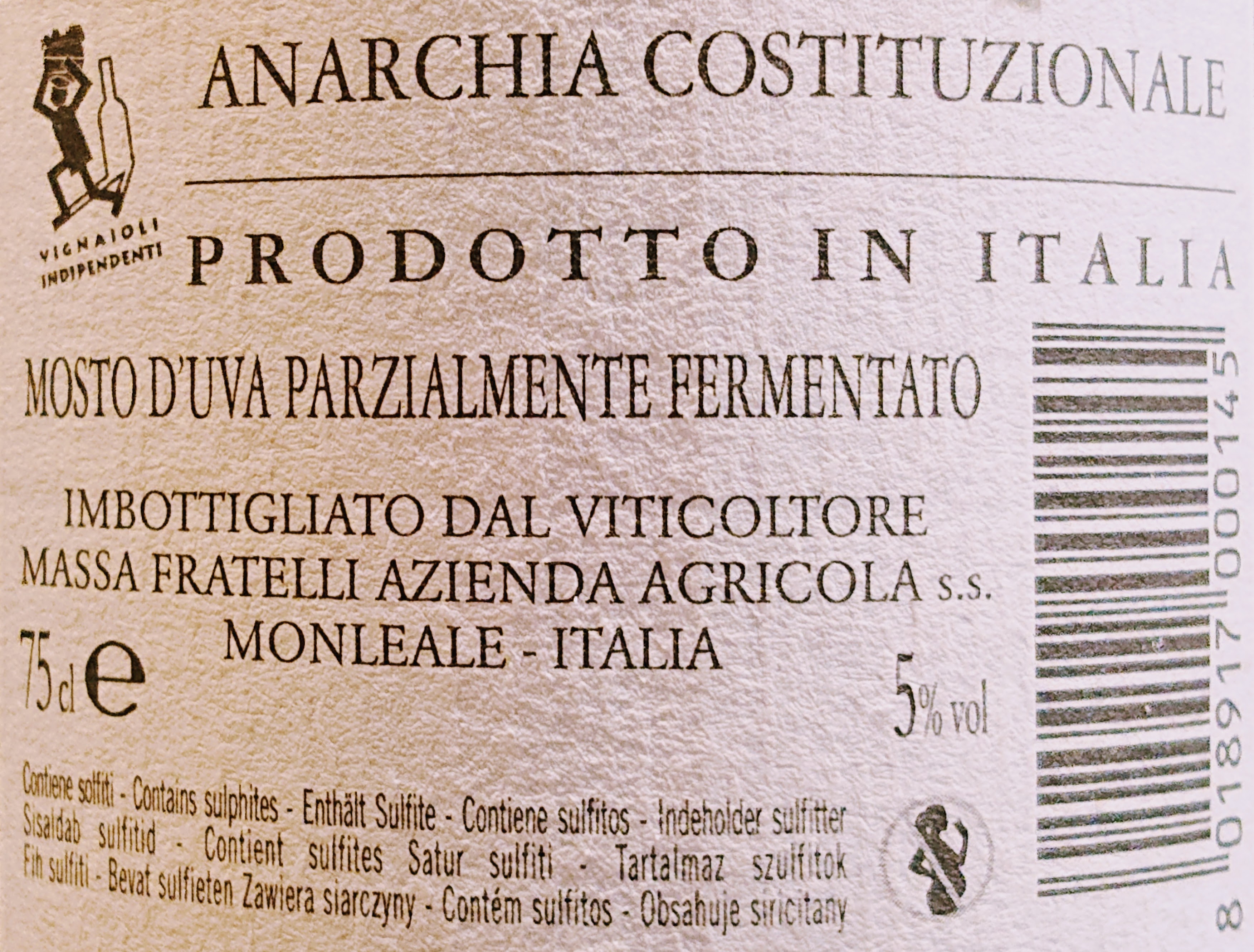 L’assaggio odierno è un vino dolce frizzante molto originale: assimilabile ad un Moscato d’Asti – per aromaticitá, dolcezza e vitigno di provenienza – ma con un effervescenza più invadente, fin troppo a mio parere, e una complessitá aromatica spiazzante e contemporaneamente sorprendente. Giallo dorato alla vista, agrumato e fiorito al naso, in bocca mixa la pesca tabacchiera con la pera, il tè al bergamotto, la rosa🌹, con una nota finale di ginger “a pizzicare” le papille linguali: mai assaggiato prima, una bollicina dolce di tale originalitá e complessitá aromatica! Ovvio e naturale, quindi, che Anarchia Costituzionale 2020 – realizzato dalla cantina piemontese Vigneti Massa – riesca a guadagnarsi facilmente la fascia di valutazione maxima. O no?🤔