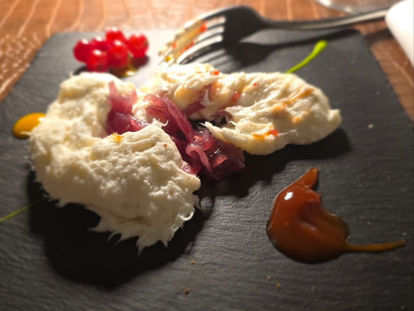 Si prosegue con un baccalà mantecato su cialda croccante e cipollotto: semplicemente perfetto.