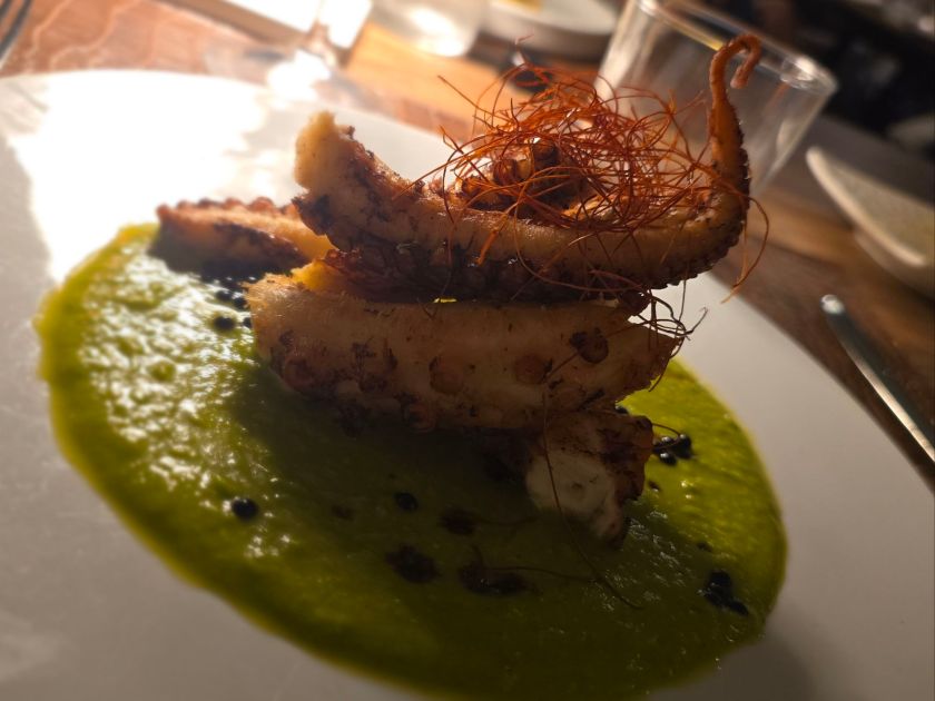 Poi arriva il filetto di branzino gratinato al forno, contornato da pomodorini/olive/patate/salsina: ottimo! Ma il piatto INDIMENTICABILE è il polpo in 2 cotture su purea di piselli, curry e gocce di balsamico: croccante fuori, morbido dentro.《Alessandro! Questo polpo è "fuorilegge": te ne sequestro un'altra porzione...😋》Che altro aggiungere? Che la proxima volta assaggeremo anche i primi: ho sbirciato al tavolo accanto ◇ gnocchetti con i gamberi🍤 che facevano gola a vederli ♡ ravioli neri con ragout di seppioline e pomodorini🍅.
