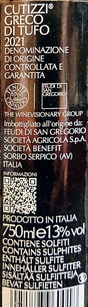 ... a 4 anni di distanza dalla vendemmia! Diciamolo subito, il tappo è intatto e al colore - giallo paglia dorato - il vino sembra perfetto. I profumi, tutti incentrati su agrumi stramaturi con un pouffe di pesca sullo sfondo, sono invoglianti la beva. Che si presenta decisamente sontuosa, fruttata, con un equilibrio a dir poco esemplare tra le note acido~minerali, che donano profondità ed eleganza, e quelle morbide, quasi abboccate, che trasformano il gesto di bere un bicchier di vino, in un'emozione paradisiaca😋. Attenzione⚠️, non è una cosa scontata, non è una cosa che capita con ogni bottiglia. In questo caso, Pierpaolo Sirch - nel doppio ruolo di agronomo & enologo per F.S.G. - ha fatto una magia: ha trasformato un vino a base di uva greco originaria di un paesino dell'avellinese (Tufo, appunto, con le vecchie miniere di zolfo che lo caratterizzavano) in un nettare di-vino INEGUAGLIABILE. Ecco perchè le 5 coppe🏆🏆🏆🏆🏆 del Greco di Tufo DOCG Cutizzi 2021, griffato Feudi di San Gregorio, se le merita anche il winemaker. E brave anche le 2 Guide vini Bibenda e Vitæ (2023 edition), che lo hanno apprezzato e valutato al TOP (5 grappoli🍇🍇🍇🍇🍇FIS, 4 viti AIS).