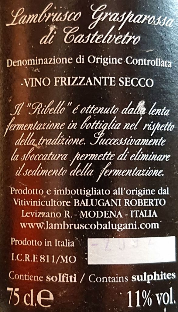 ...Cavalier Mario Balugani creava in queste terre... Oggi, nelle stesse terre, è Roberto Balugani a fare i vini, composti da "solo bollicine": 2 bianco + 2 rosso. Quello in assaggio oggi è il Lambrusco Grasparossa di Castelvetro DOC Ribello, "prodotto e imbottigliato all'origine dal Vitivinicultore" (applauso👏). E per la tipologia è cosa rara, dati gli enormi numeri di bottiglie prodotte in quantità industriale, dai big del Lambrusco. Ma non divaghiamo e passiamo subito all'assaggio: rosso rubino vivace appena versato, con bollicine fragranti e non troppo abbondanti (un grande pregio!), con profumi di frutta boschiva rossonera (no, non mi riferisco all'A.C. Milan😁) ossia fragolina di bosco e mirtillo selvatico. In bocca è secco e vinoso, di una pulizia ed eleganza di beva decisamente rara per la tipologia. Ribello non è piacione, non è ruffiano, ma è stramaledettamente gustoso, succoso, che...non smetteresti mai🤪 di riempire la scodella (il termine corretto è "la fojeta"), come tradizione vorrebbe. Perchè Ribello di Balugano è un CAPOLAVORO🏆🏆🏆🏆 che fa della Tipicità - sì, con la "T" grande - il suo caposaldo.