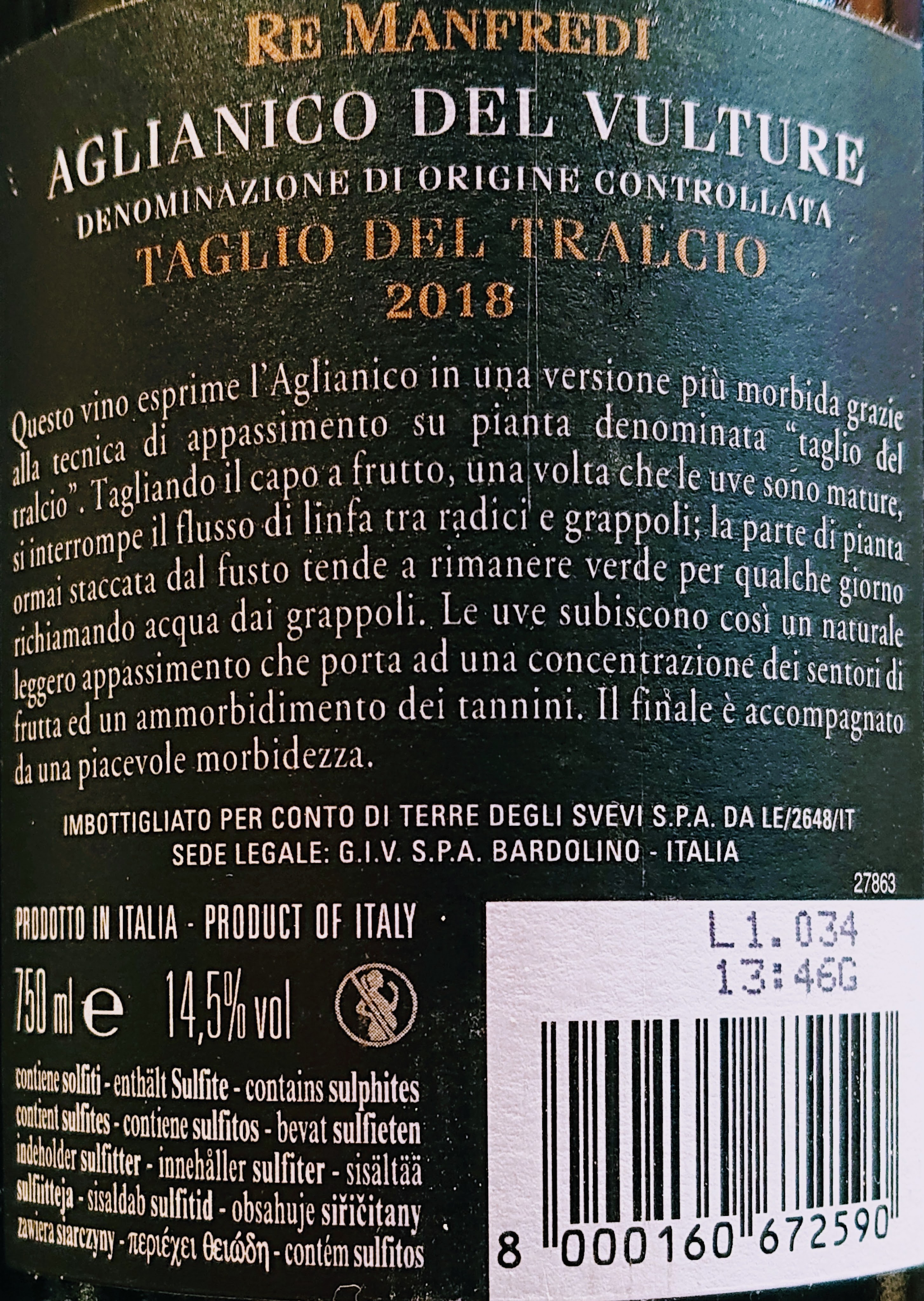 Devo dire che l’assaggio dell’Aglianico del Vulture DOC 2018 di oggi – vinificato da Terre degli Svevi – marchiato Re Manfredi e dal suggestivo nome “Taglio del tralcio”, fa quel che promette. Come da tradizione per la DOC lucana, l’aglianico si presenta di color rosso scurissimo, con profumi invitanti di marmellata ai frutti di bosco e con attacco in bocca potente e contemporaneamente morbido. Ecco, é proprio la morbidezza e la conseguente rotonditá di beva, il leit motiv di questo Taglio del Tralcio, che si chiama così proprio per l’utilizzo di uve leggermente appassite in pianta***, con un risultato di magistrale gestione della potenza tipica del vigneto, che qui vira verso toni di fascinosa eleganza, senza traccia alcuna di spigolositá e/o sgradevoli sentori acetici residui. Tale piacevolezza di beva è comunque supportata da una buona persistenza gustativa e un ottimo retrogusto, intenso e pulito. Siamo davanti ad un altro vino CAPOLAVORO🏆 messo a segno da una cantina G.I.V. (Gruppo Italiano Vini), di grande tipicitá e succositá, con il bonus di un prezzo di vendita che sta ben sotto i 15€. [comprato su VINICUM a questo prezzo]