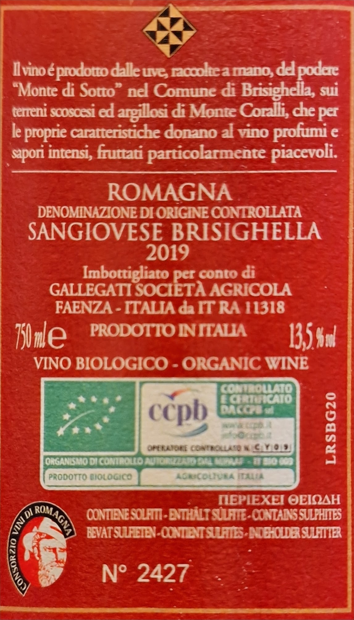 …con i 3 bicchieri 🍷🍷🍷 del Gambero🦐 Rosso 2022, le 4 viti di Vitae 2022 e come Vino Quotidiano eccellente by Slow Wine 2022, che vado subito a stappare: mi desta sorpresa il color rubino scarico mentre lo verso nel calice, mi aspettavo un sangio dal colore più profondo. Pure il naso e l’attacco in bocca sono timidi e allora, preso dal dubbio🤔, mi munisco di caraffa e gli riservo il trattamento “da Riserva”. I profumi si aprono lievemente ed evocano fragole🍓 e frutti rossi, però il sorso non è dotato di quella ricchezza di frutto tipica dei Sangiovese di Romagna DOC, qual è questo Brisighella Corallo Rosso 2019 griffato Gallegati, alias i fratelli Antonio e Cesare [scoprili qui]. E quindi risulta di struttura delicata, seppur gustosa e piacevole. Evidentemente la cifra stilistica di questo rosso romagnolo è più improntata alla freschezza (tanta) che all’opulenza (poca). Nel complesso, Corallo Rosso 2019 risulta STRABUONO💘, beverino, dinamico, di facile abbinamento, ma non certo ai vertici della tipologia come faceva presupporre il ricco palmarès ottenuto sulle 3 Guide vinicole sopracitate. Controetichetta con luci e ombre: benissimo per la certificazione BIO🌱, meno bene per la dicitura “imbottigliato per conto di Gallegati…da IT RA 11318”.