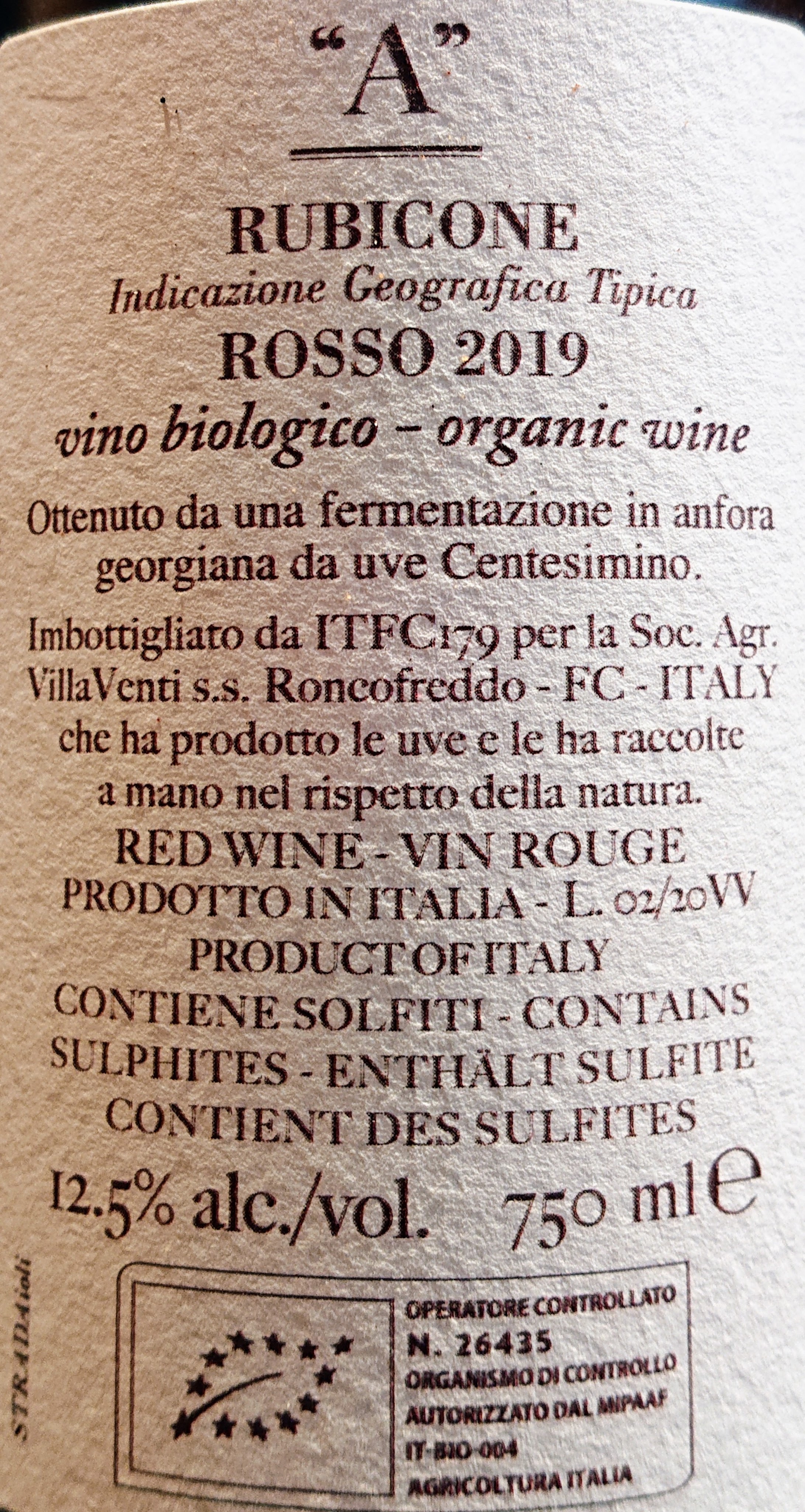 Post Scriptum: etichetta bella e accuratamente realizzata, da voto maximo; controetichetta da voto minimo, per la scritta “imbottigliato da~per conto di”…